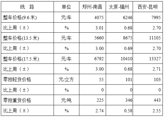 分車型看,各車型指數環比漲跌互現。其中,整車指數為989.82點,比上周回升0.09%;零擔輕貨指數為968.38點,比上周回落0.01%;零擔重貨指數為989.84點,比上周回升0.08%。